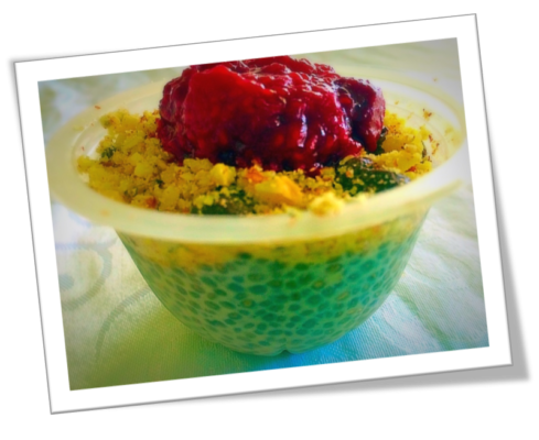 - Top the chia cups with the nuts and choc chip crumble mixture and garnish with a teaspoon of slightly warm raspberries sauce on top