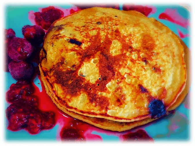 - Serve with fresh sliced strawberries or raspberries (if you have frozen raspberries heat them up to make a lumpy sauce and drizzle on the pancakes)