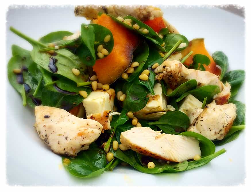 Low FODMAP Spinach Salad with Chicken, Pumpkin with Toasted Pine Nuts Low FODMAP Spinach Salad with Chicken, Pumpkin with Toasted Pine Nuts