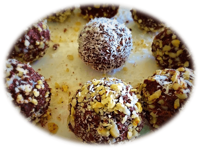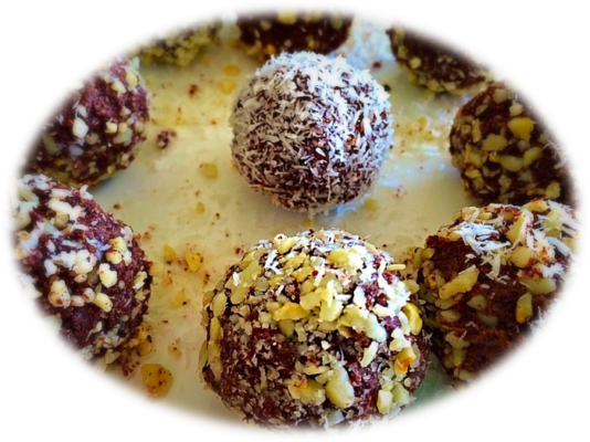 4. Roll half of the choc balls in desiccated coconut and the other half in chopped nuts
