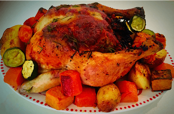 - Check the chicken halfway through cooking and if the chicken and the vegetables look a bit dry, baste them with the pan juices or add a couple of tablespoons water to the roasting pan